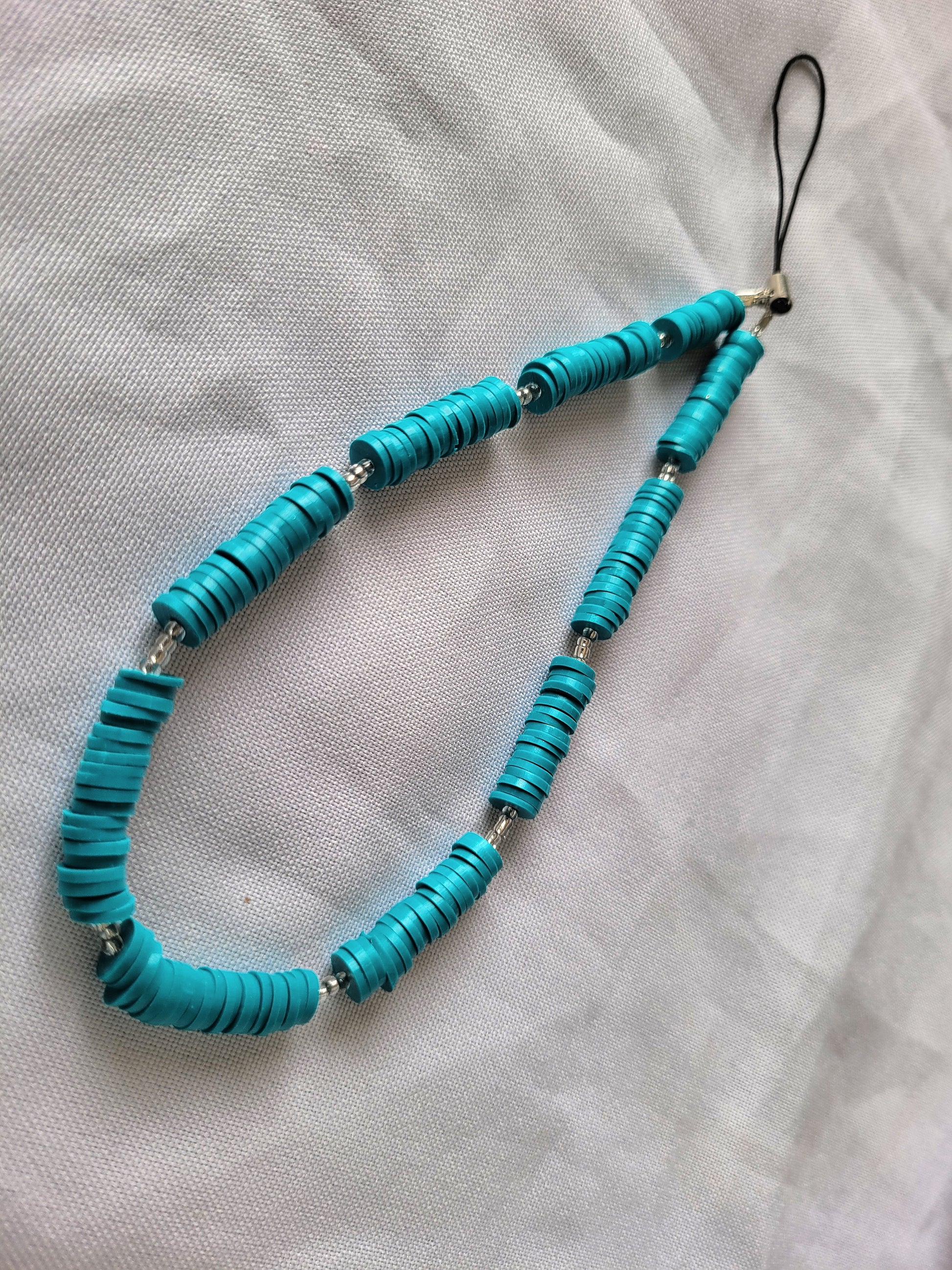 Le bijoux de téléphone bleu mesure 13,5 centimètres et se compose de perles Heishi bleu canard.