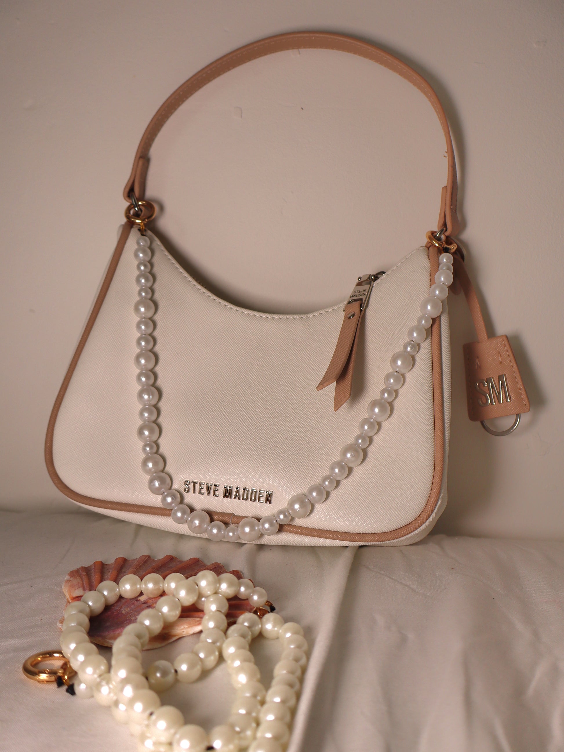 - Pour accessoiriser vos sacs ou vos tenues, une nouvelle chaînette aux perles beige nacrées avec un fermoir doré en acier inoxydable.