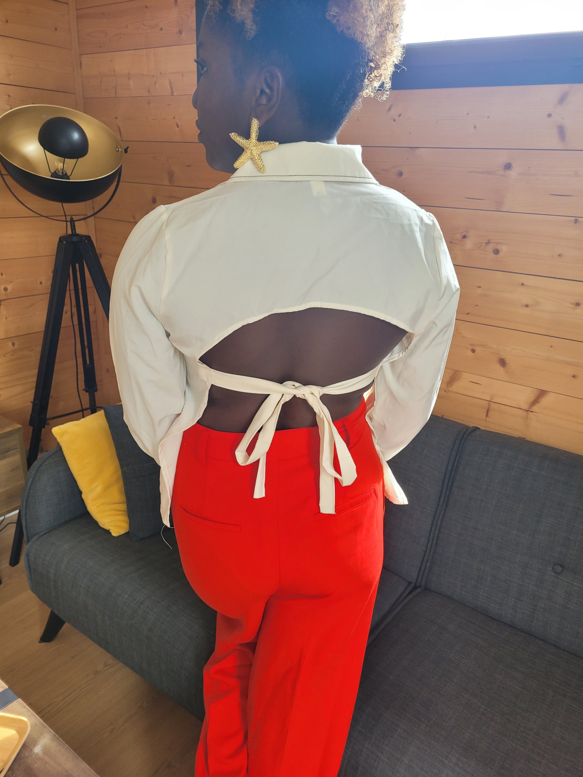 • La chemise blanche dos-nu à bordures noires, elle à une coupe cintrée et une fermeture à boutonnage, à fermer entièrement ou non... elle laissera entrevoir une partie de votre dos .