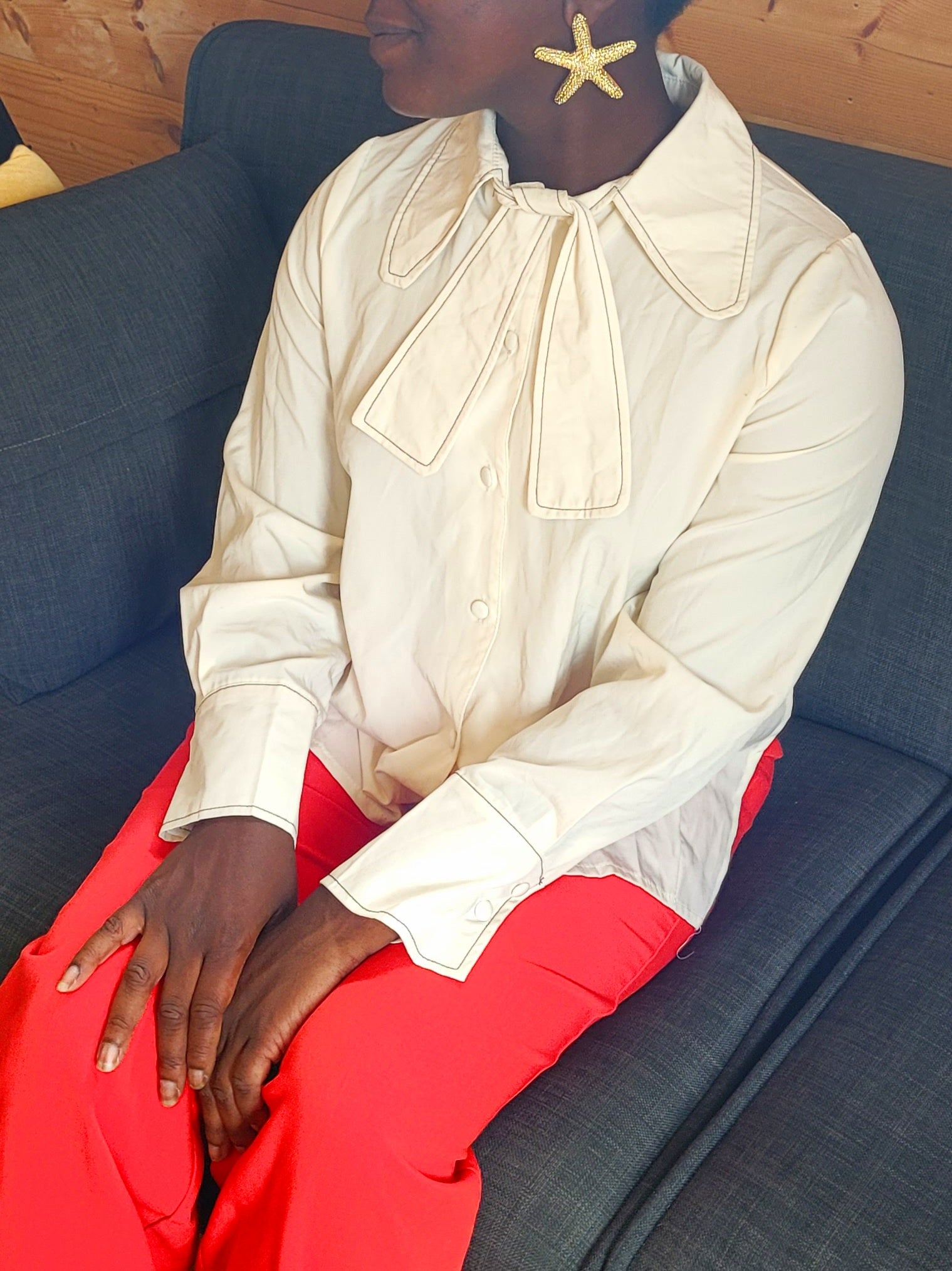 • La chemise est upcyclée ; elle à été réalisée à partir d'une chemise de seconde main achetée en friperie.