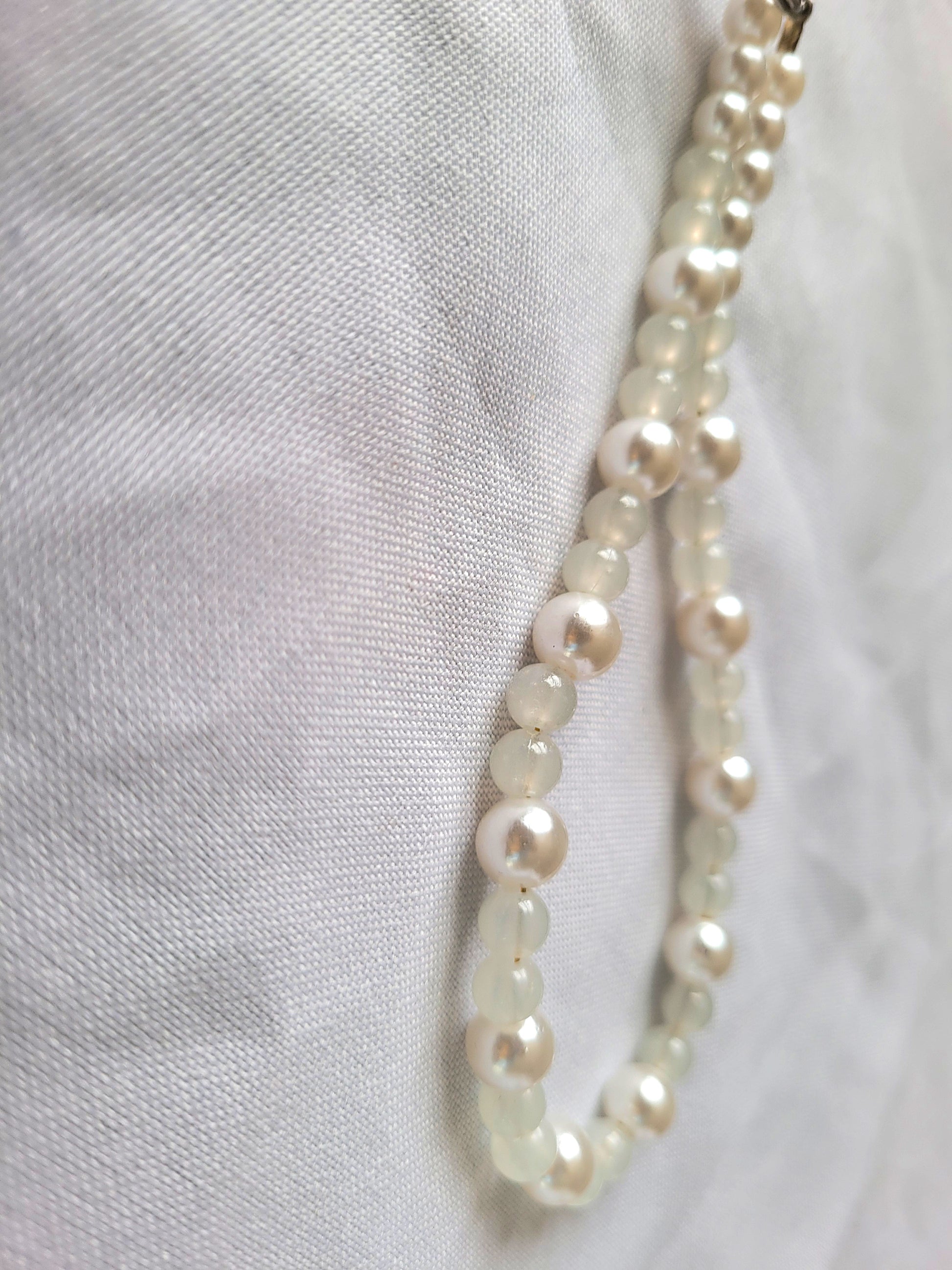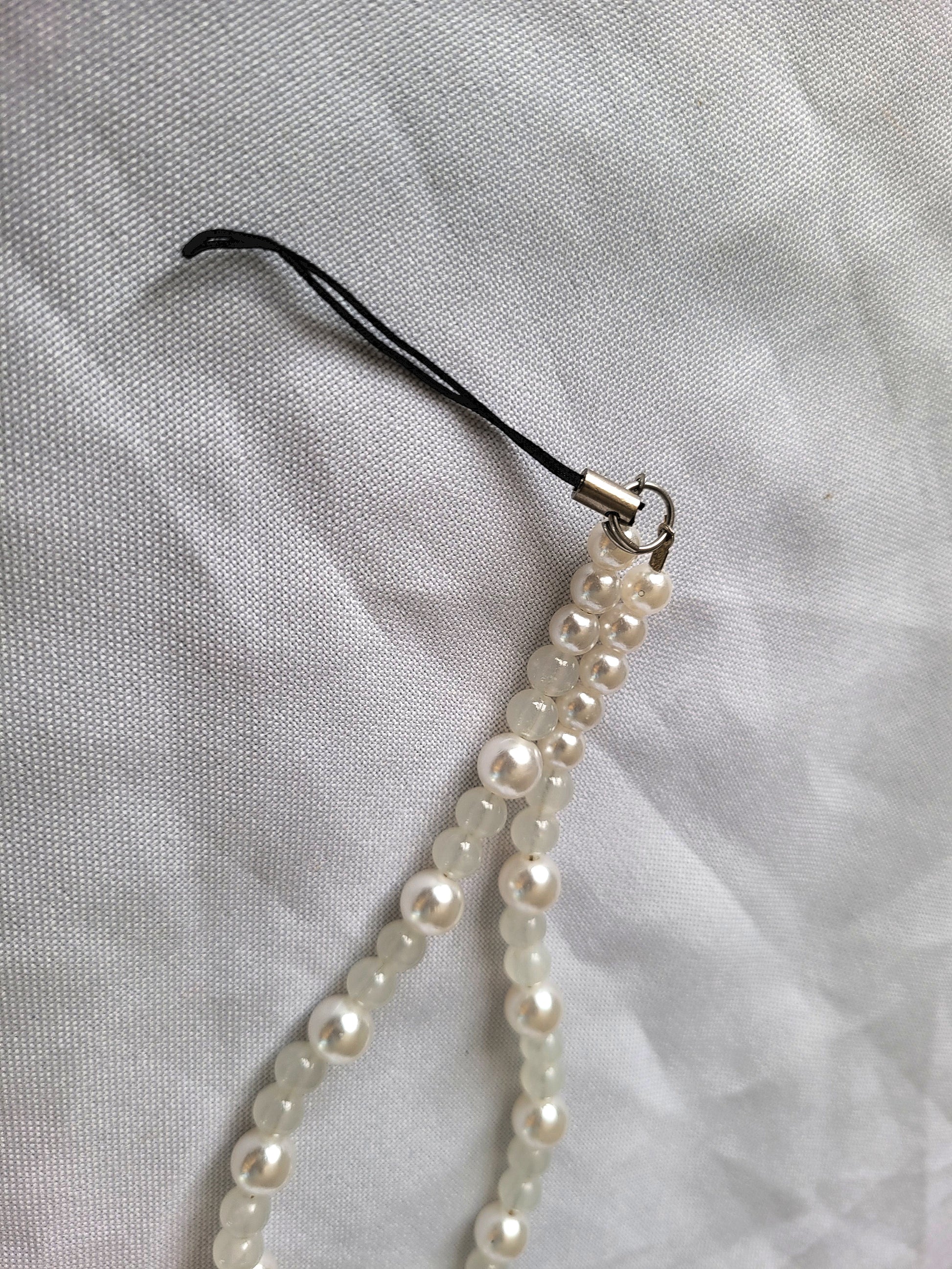 Le bijoux de téléphone Blanc Phosphorescent mesure environ 11.5 centimètres et se compose de perles blanches nacrées en plastique et de perles phosphorescente blanche en acrylique.
