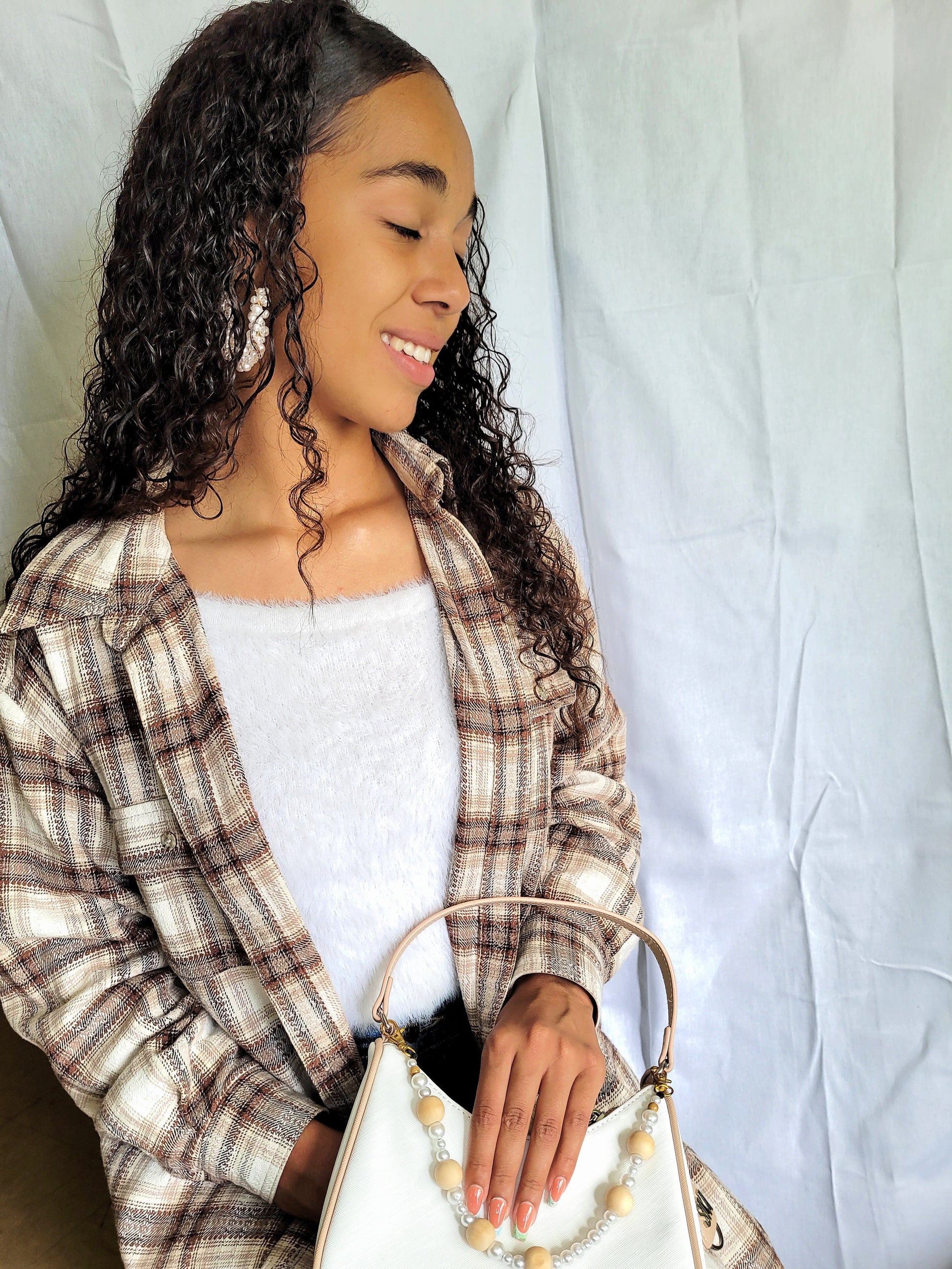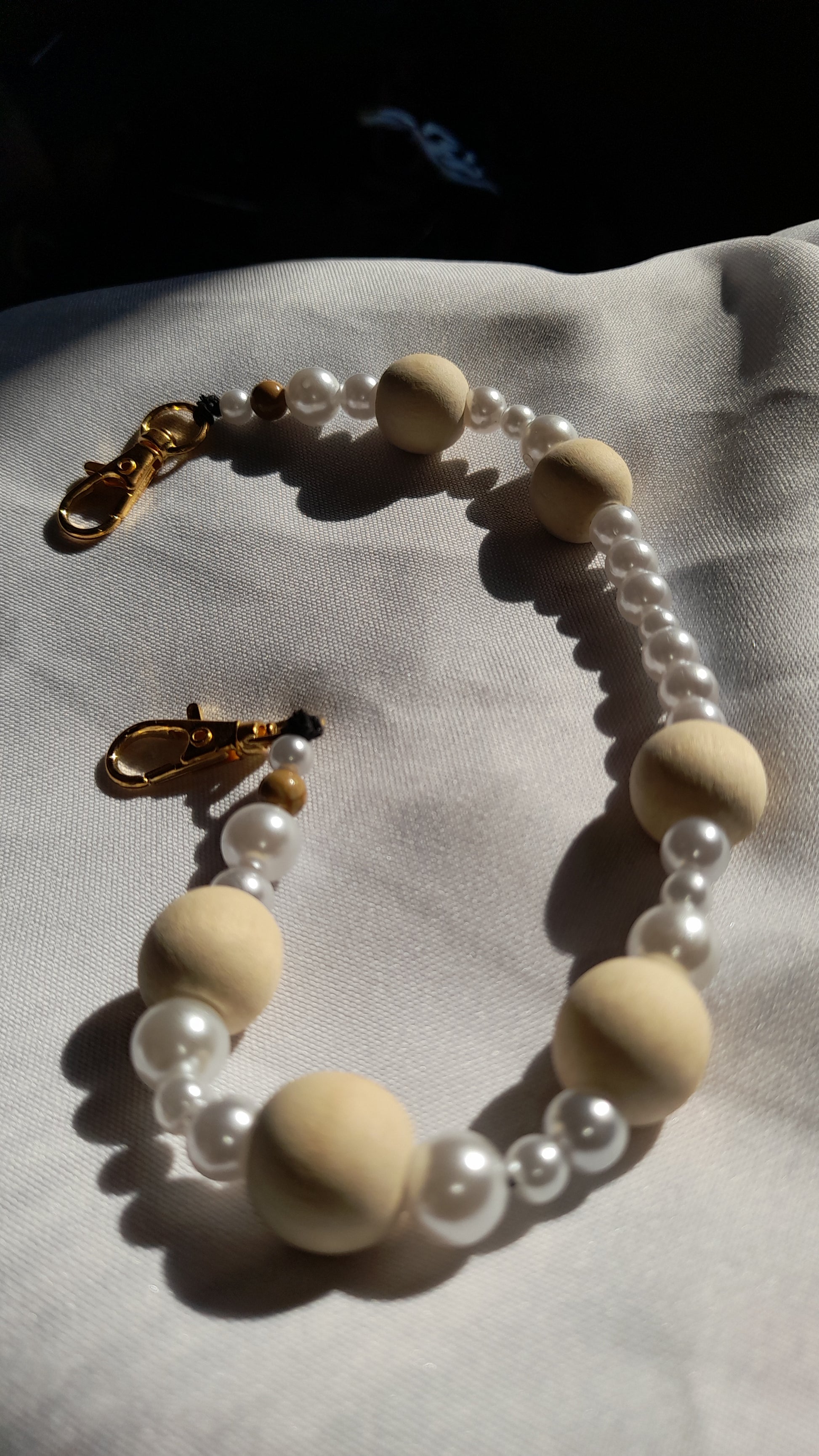 - La chaîne de sac se compose de perles en plastique blanches nacrées et de perles en bois clair
