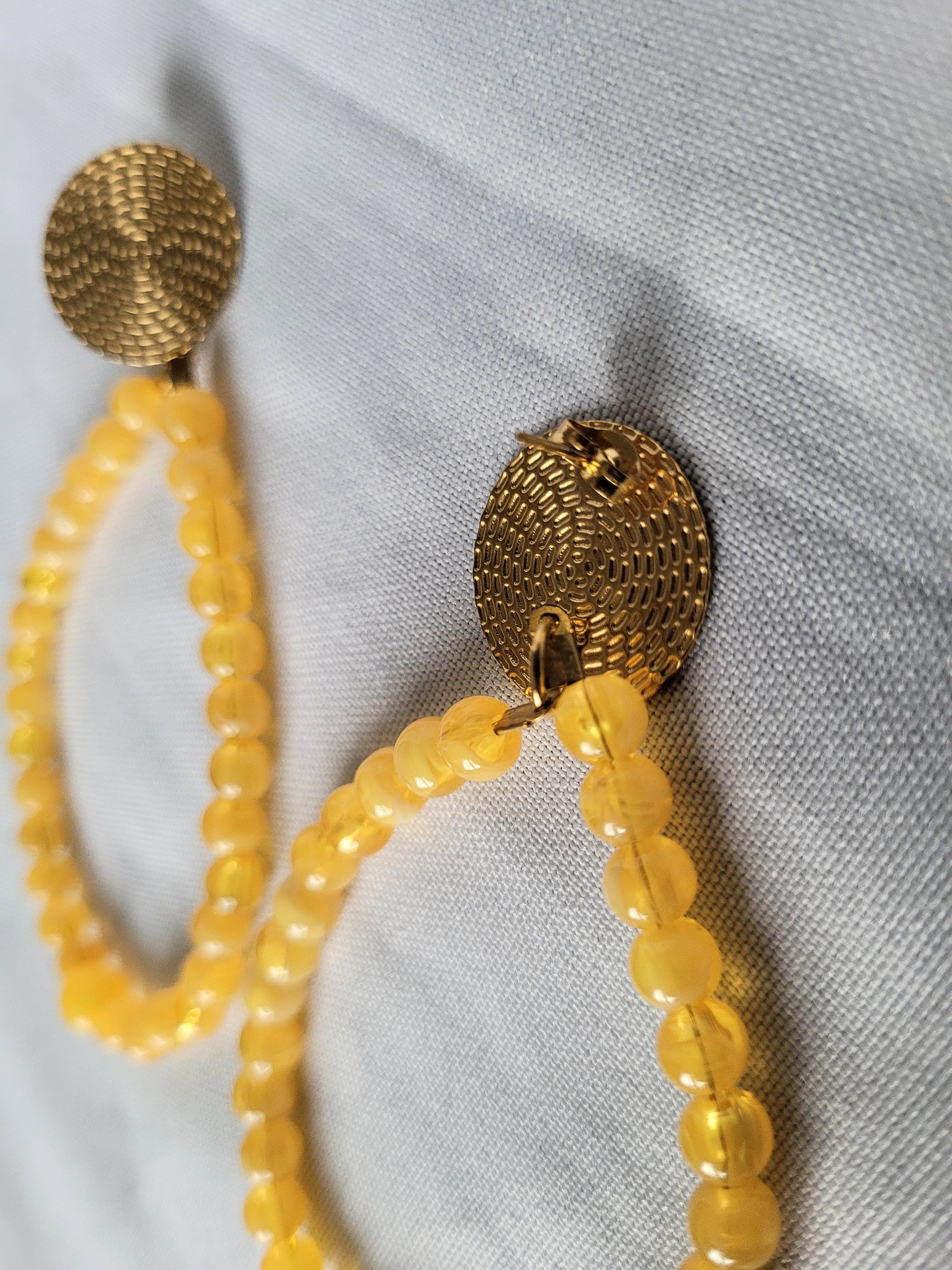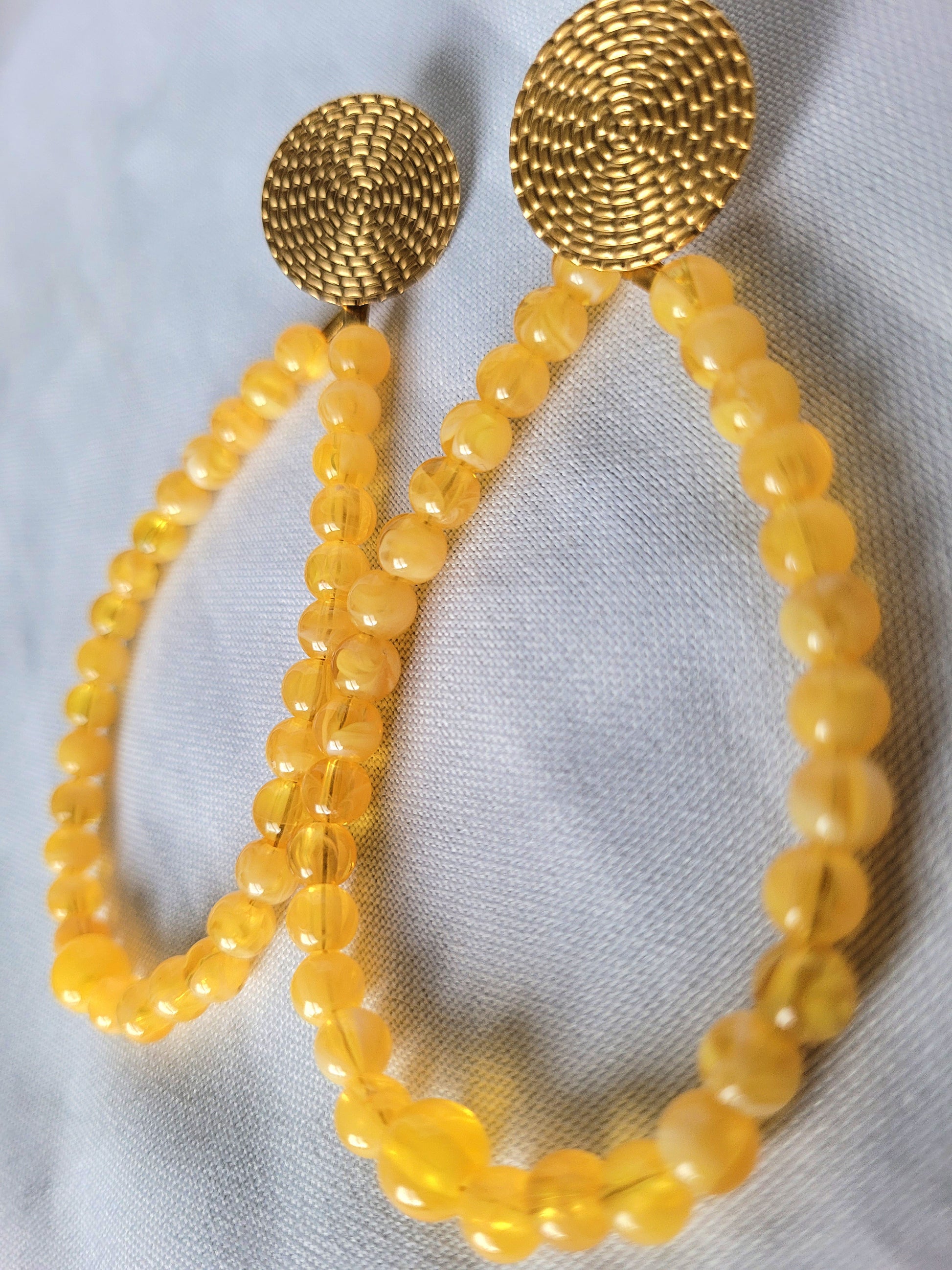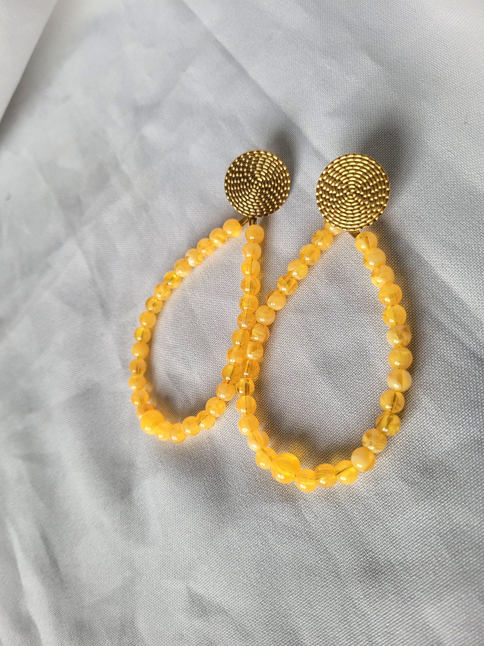 De belles boucles d'oreilles fantaisie jaune marbrées pour orner vos oreilles !