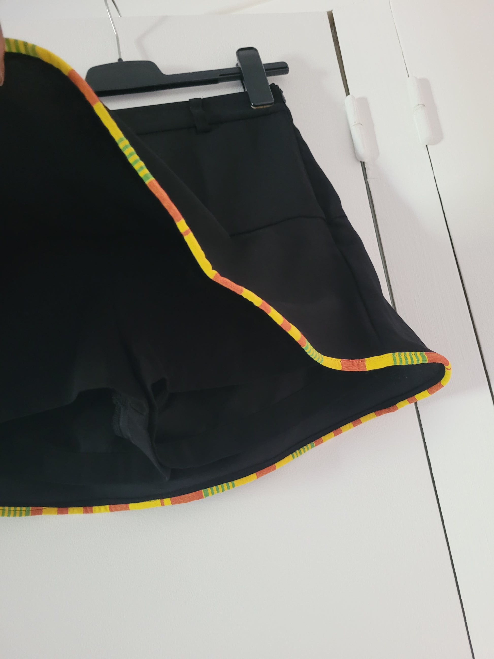 C'est une jupe short de seconde main de la marque Pimkie à laquelle nous avons ajouté une touche de madras.