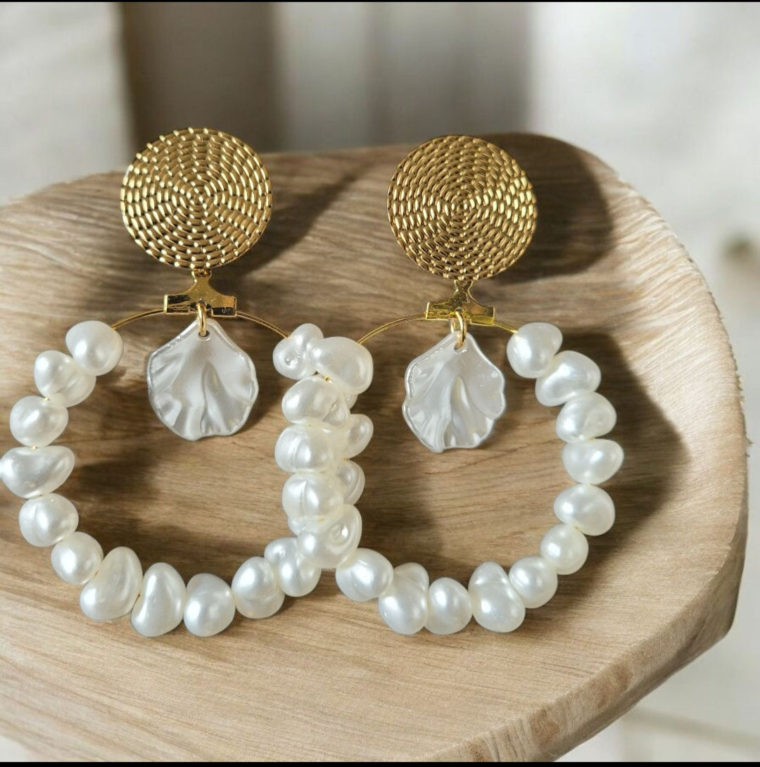 Boucles d'oreilles de 4 centimètres de diamètre (6 avec l'attache) ornée de perles en plastique blanches irrégulières.