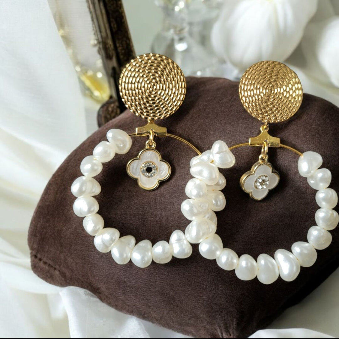 Boucles d'oreilles de 4 centimètres de diamètre (6 avec l'attache) ornée de perles en plastique blanches irrégulières.