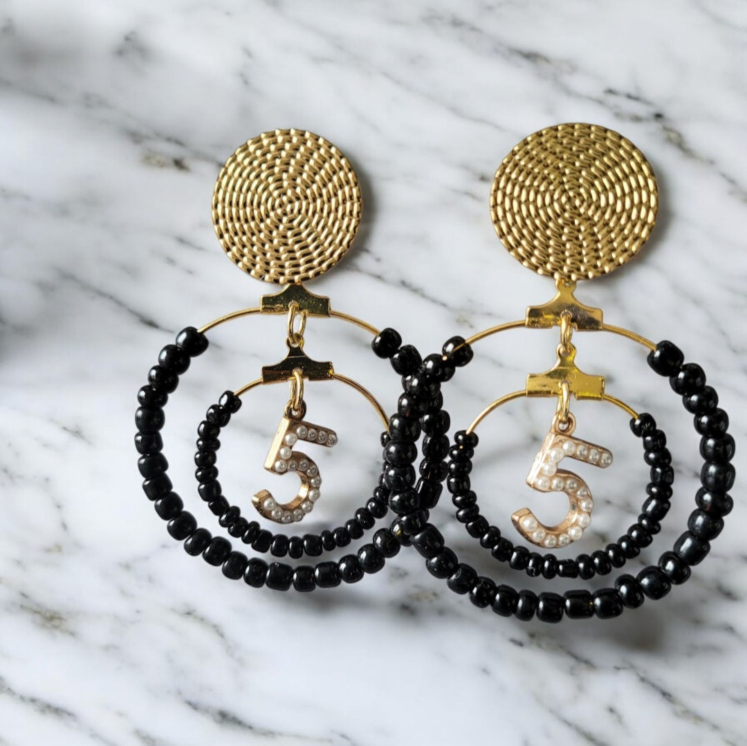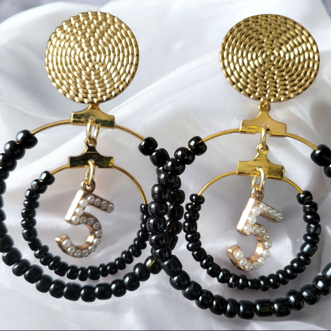 Boucles d'oreilles de 4 centimètres de diamètre (6 avec l'attache) ornée de perles de rocaille noire.