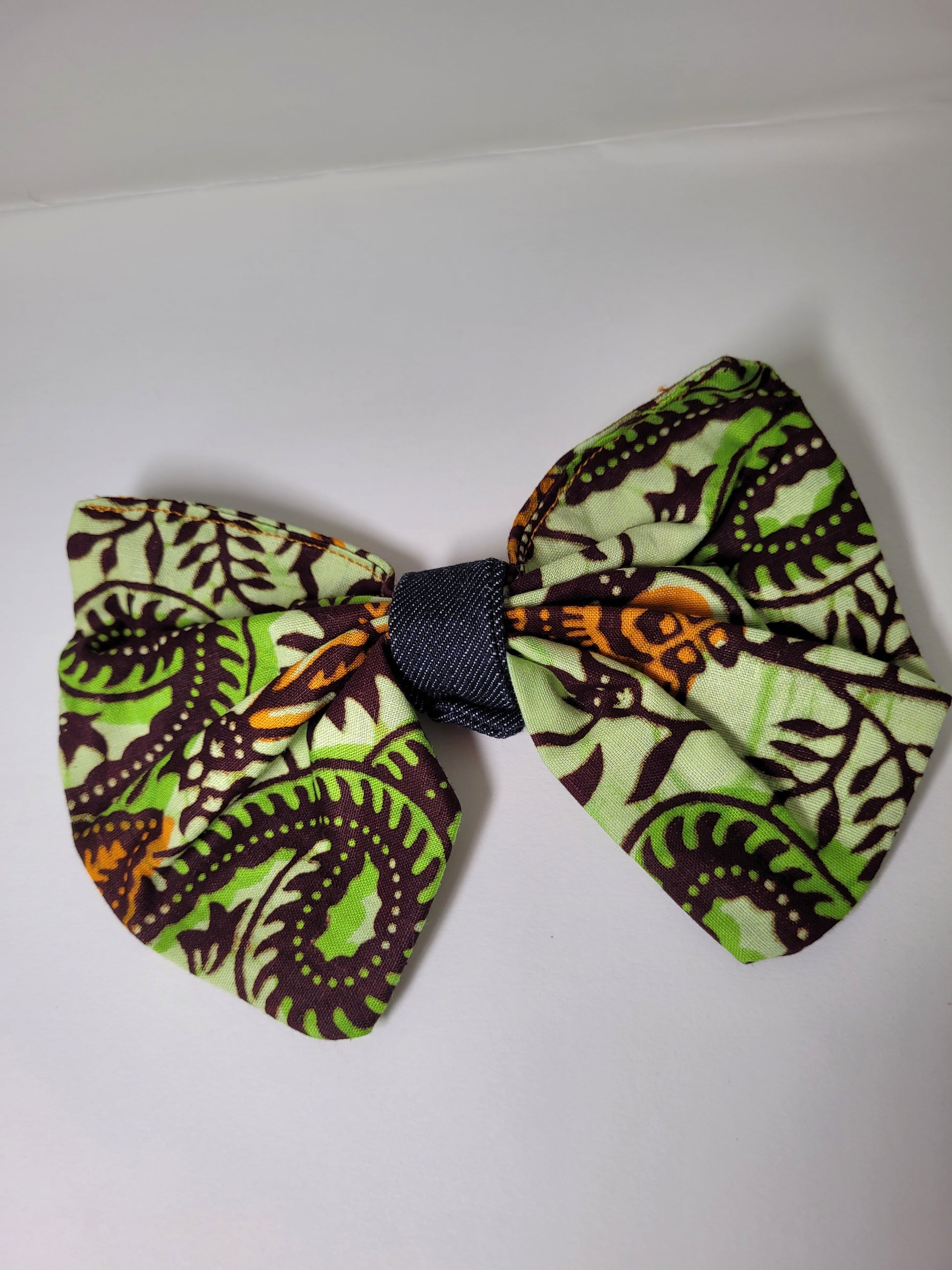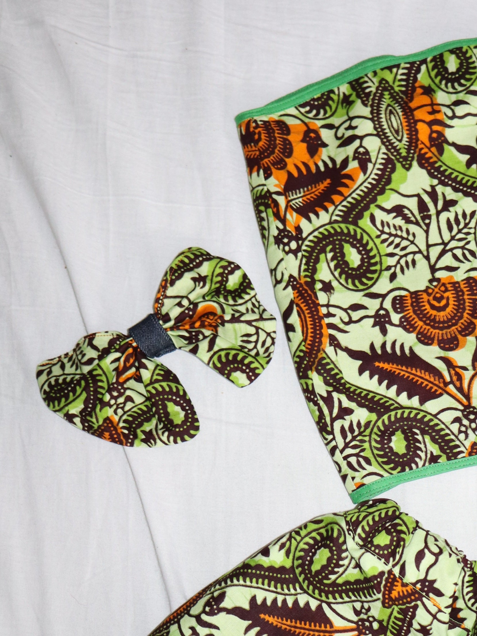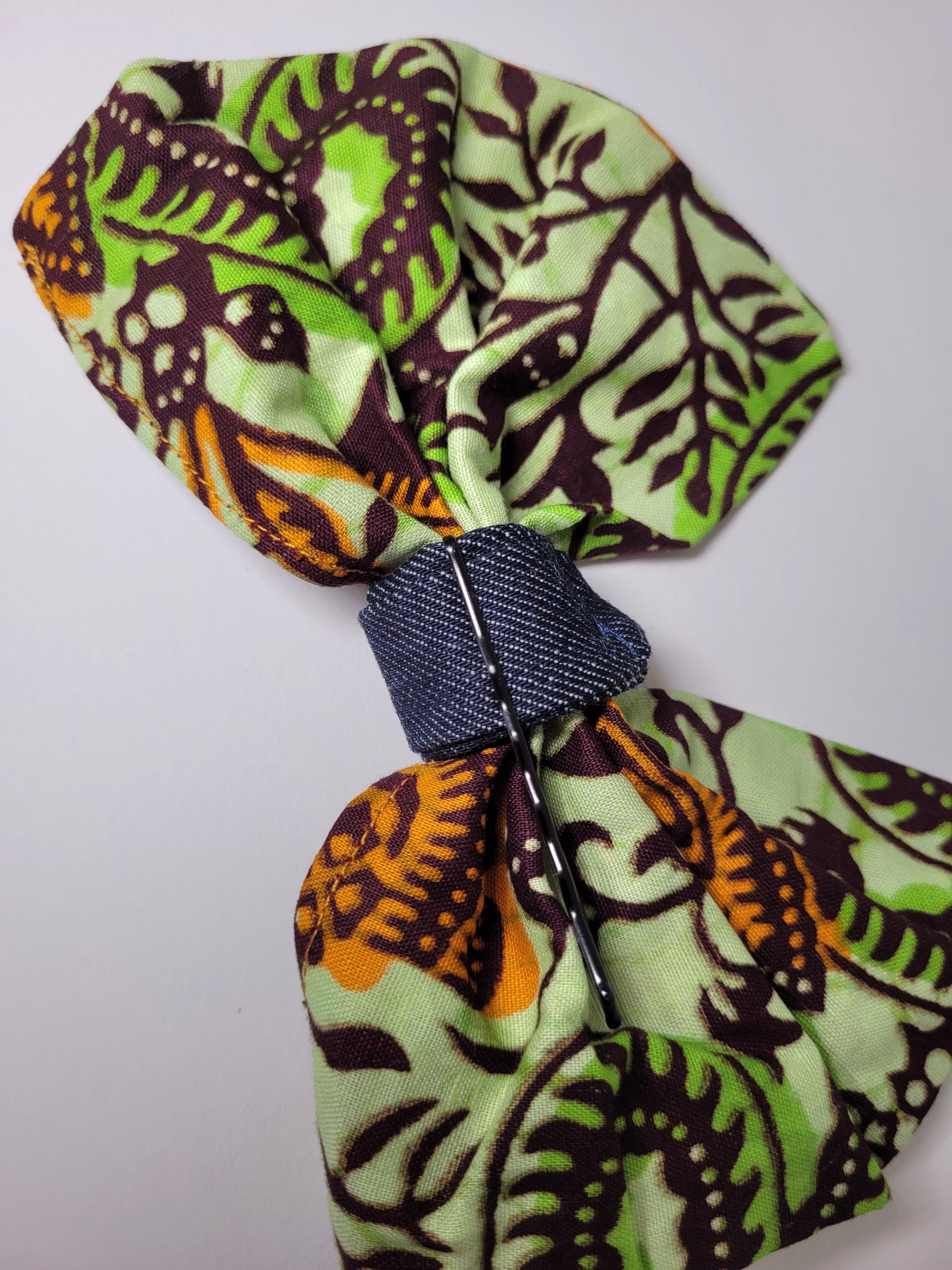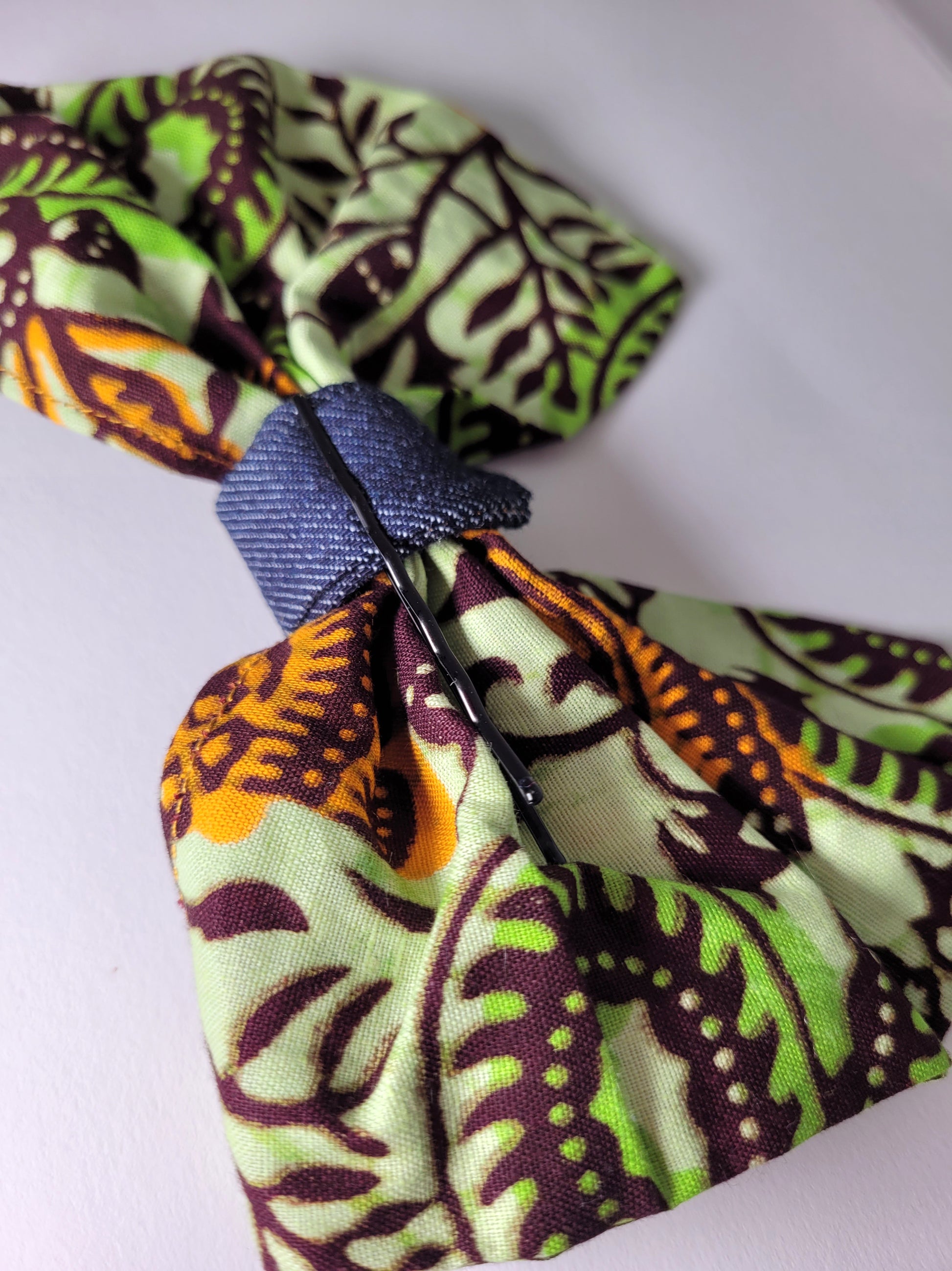 A partir de chutes de tissus d'anciens projet le noeud wax vert à vu le jour ; du wax en coton vert et du jeans bleu foncé.