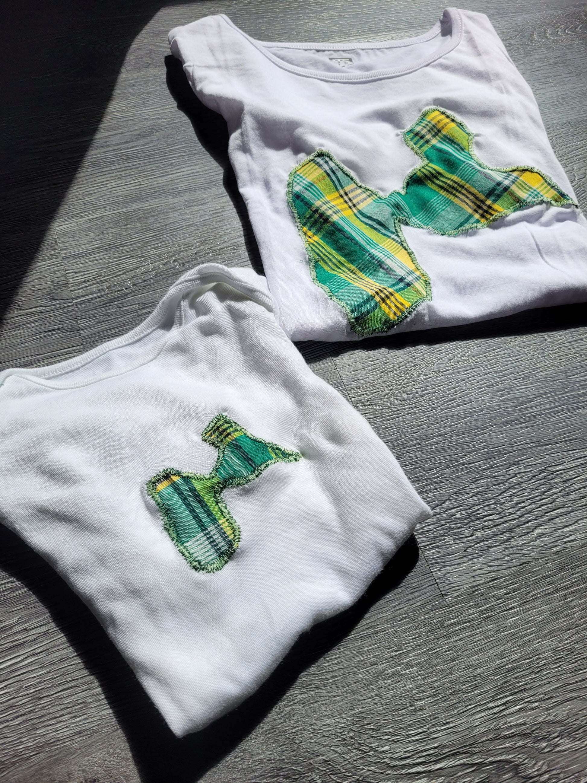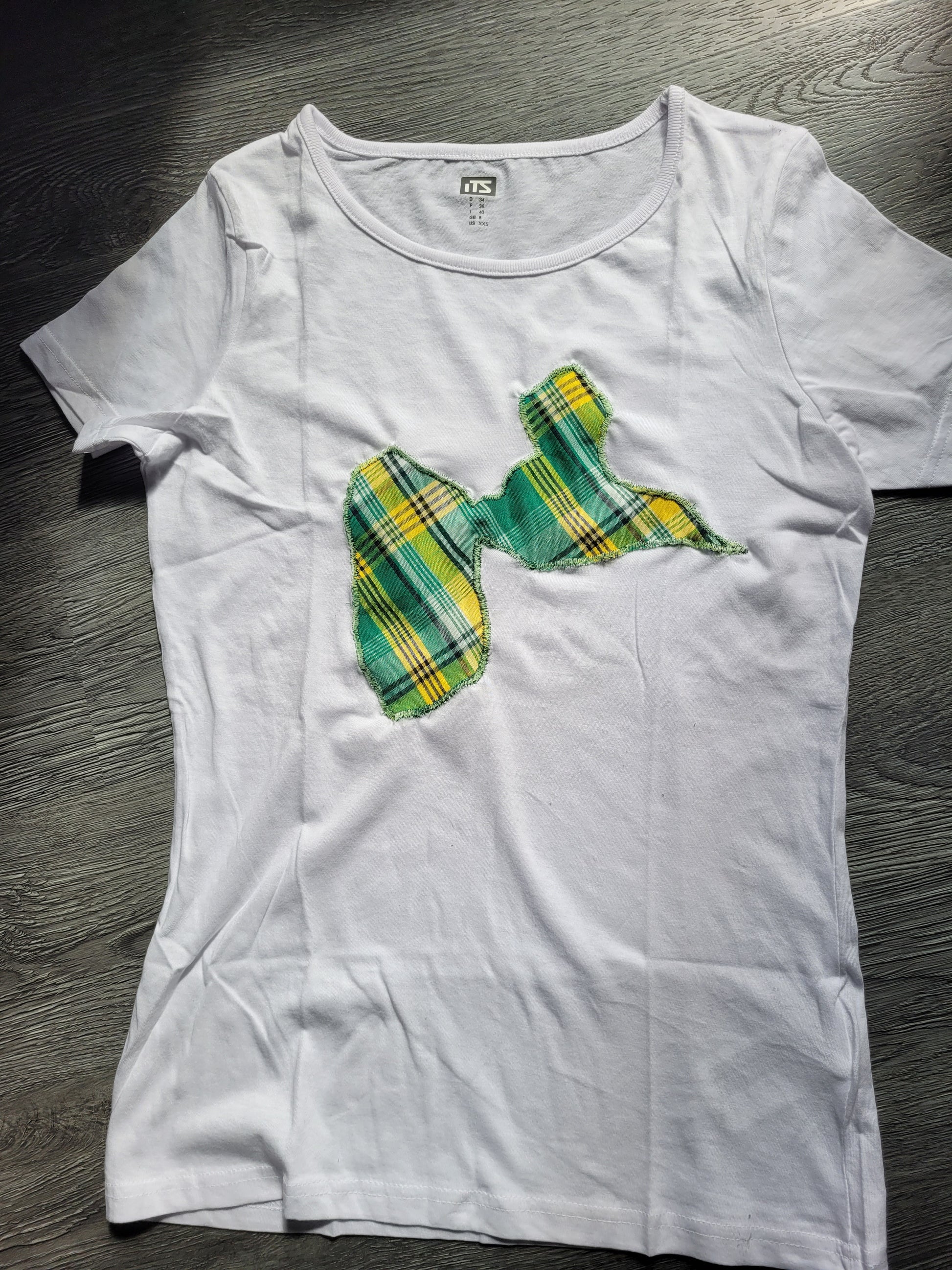 Le tee-shirt mixte blanc avec une carte de la Guadeloupe brodée en tissus madras vert en coton.